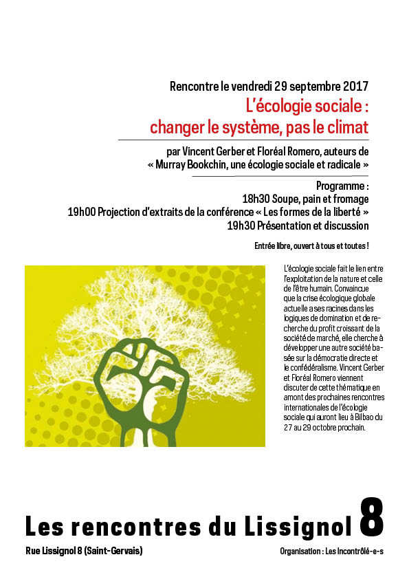 Vincent Gerber et Floréal Romero, coauteurs du livre « Murray Bookchin, une écologie sociale et radicale » (éd. le Passager Clandestin) viendront discuter de l’écologie sociale à Genève, dans le cadre des Rencontres du Lissignol 8.